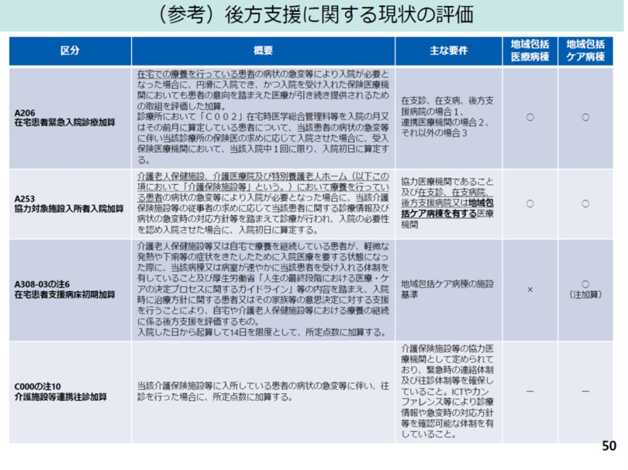 こうした協力医療機関による高齢者の介護施設への連携や後方支援を評価する診療報酬上の評価には以下がある。①在宅患者緊急入院診療加算、②協力対象施設入所者入院加算、③在宅患者支援病床初期加算、④介護施設等連携往診加算。