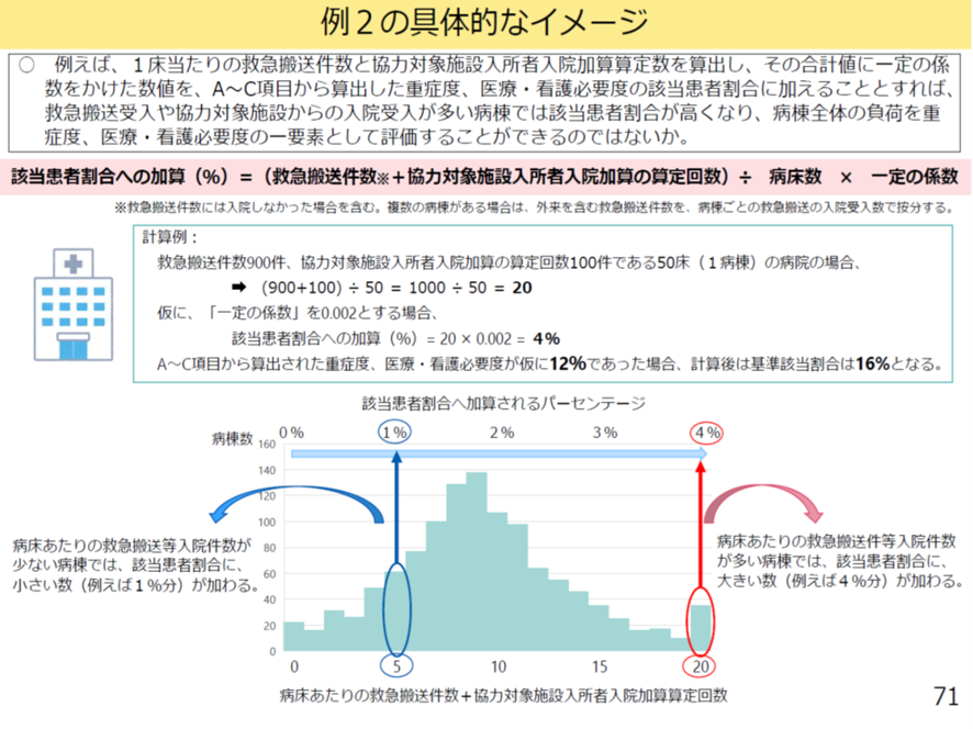 つぎに合算数を当該病院の病床数で除す。これにより規模に関係ない「当該病院における救急搬送患者対応に向けた実績」を見ることができる。そしてこの数値に一定の係数をかけ、「看護必要度該当患者割合」に加算する。