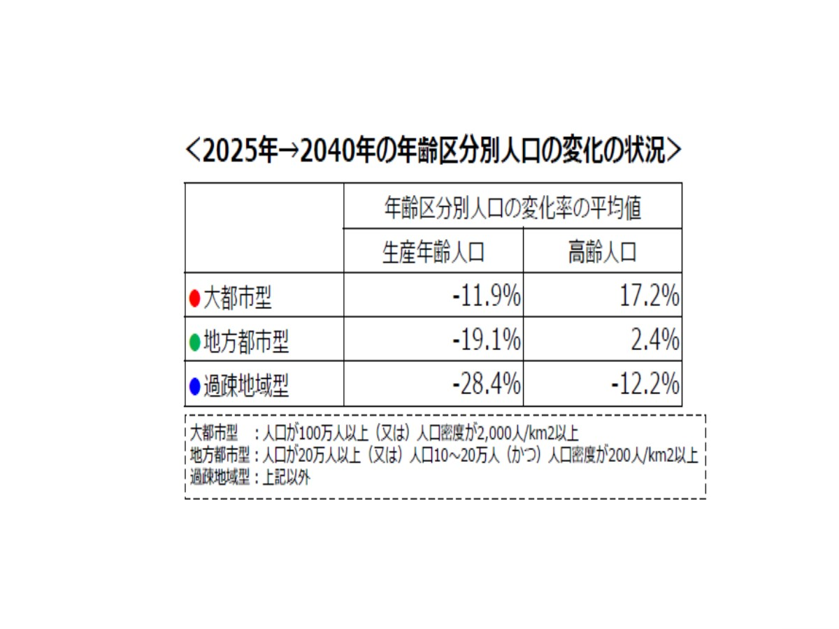 そして新たな地域医療構想では、全国を人口動態の変化パターンで以下の3つに分けることにした。大都市型(人口100万人以上)、地方都市型(人口20万人以上または人口10万人~20万人)、過疎地域型の3つだ。それぞれの人口動態の2040年へむけての変化を見ていこう。大都市型では生産年齢人口は減るが、高齢者人口は増加する。地方都市型では生産年齢人口は減るが、高齢者人口は微増となる。過疎地域型では生産年齢人口も減るが、高齢者人口も減少する(図表2)。