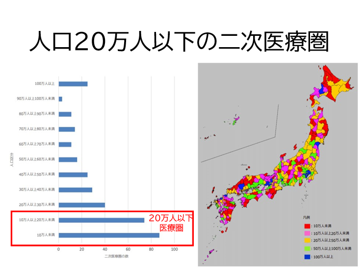 このように人口動態が地域ごとに異なるため、新たな地域医療構想では、全国一律の対応は困難だ。特に地方都市型や過疎地域型では、人口減少のため二次医療圏も人口が10万人を割り込み、近隣の圏域との統合が必要になる。とくに現在では人口20万人以下の二次医療圏が全国330の医療圏のおよそ157医療圏、全体の45%も占めている。日本全体の人口減とともにこの20万人以下の二次医療圏の数はこれからますます増えていくだろう(図表3)。