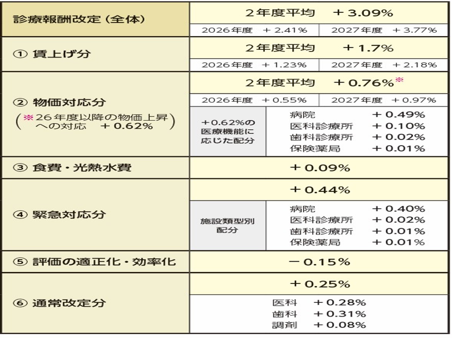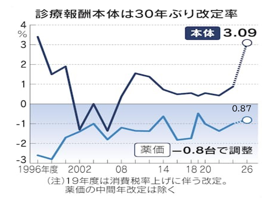 2025年12月24日に2026年診療報酬改定の改定率が厚労省から公表された。改定率は本体部分が3.09%の大幅プラス改定、そして薬価・材料改定はマイナス0.87%、ネットではプラス2.22%改定だ。