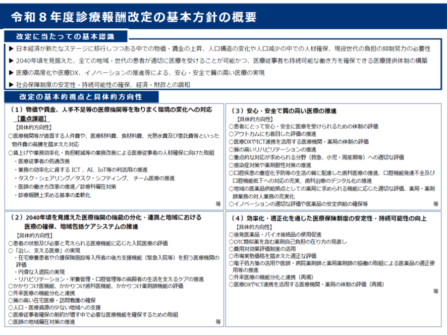 次に診療報酬改定の基本方針について見ていこう。基本方針については2025年12月4日の社会保障審議会医療保険部会において提示された。ポイントは以下の4点だ。①物価・賃金高騰、人材不足への対応(最重点事項)、②医療機能分化・連携と地域医療の確保、③安心・安全医療の質の維持・向上、④医療保険制度の持続可能性と効率化。