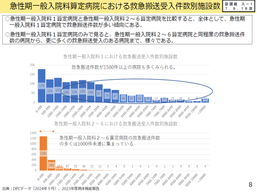 以上より、全ての急性期一般入院料1の病院が急性期機能を担う病院と考えることはできない。また急性期一般入院料2~6の病院の中にも入院料1の病院並みに救急搬送を受け入れている病院もある。こうしたことから、この議論を行った中医協の下部組織である入院外来分科会では、急性期一般入院料1の算定病院を「一般的な急性期」とすることは妥当ではなく、「救急搬送受け入れ件数」等の基準を設けて、急性期病院を定義していくべきではないかとの意見がでた。