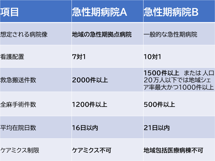 以上のような議論から、今回の診療報酬改定では急性期病院を、救急搬送件数や全身麻酔手術件数、人口の少ない地域における地域での救急搬送受け入れ状況等を踏まえて2つに区分することにした。ひとつを急性期病院A一般入院料(以下、急性期病院A)、もうひとつを急性期病院B一般入院料(以下、急性期病院B)とした。