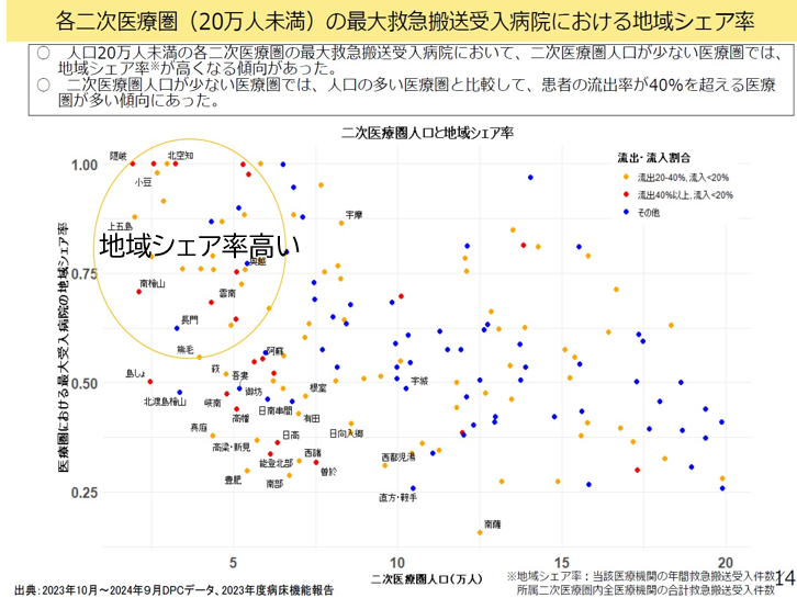 ただ急性期入院医療の指標を、年間救急搬送件数が2000件以上と一律に決めるわけにもいかない。というのも救急搬送受け入れ件数は地域の人口規模で大きく変わるからだ。人口規模の少ないところは、救急搬送件数も自ずから少ない。このため件数と同時に救急搬送の地域シェア率などの指標とも組み合わせることが必要だ。つまりシェア率で地域一番病院を選ぶのだ。