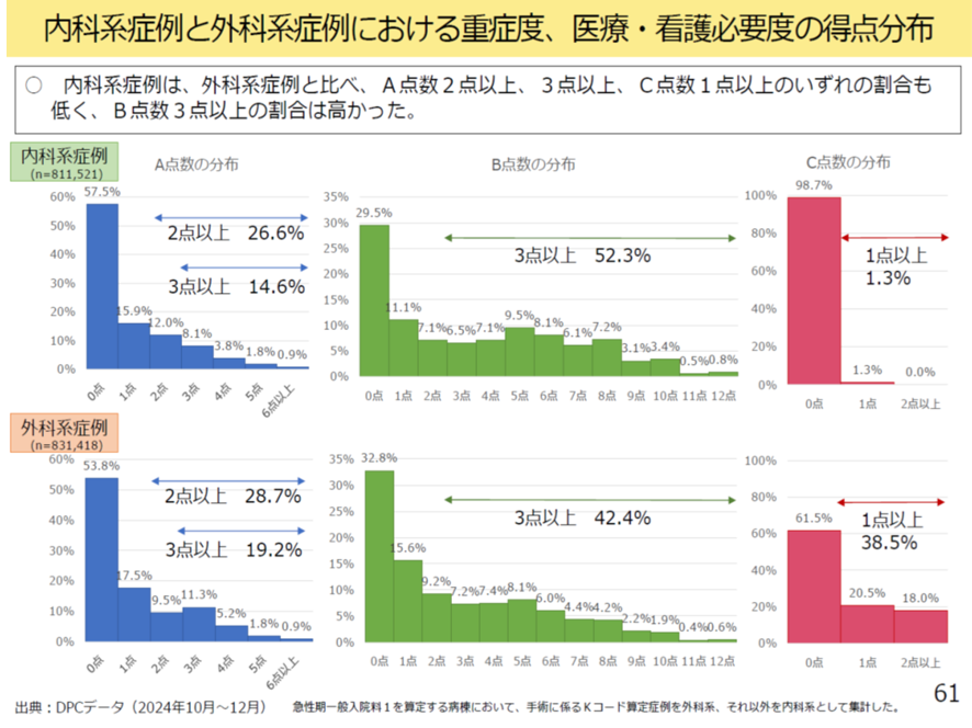 この点について、日本病院会も現行の状態では内科系症例の多い病棟では、明らかに不利で必要度を満たす患者が少なくなり経営も成り立たなくなると訴えている。こうした点から今回、内科系症例を適切に評価するため、内科系症例で頻回におこなわれる診療行為や使用される医薬品をA項目、C項目に追加することになった。