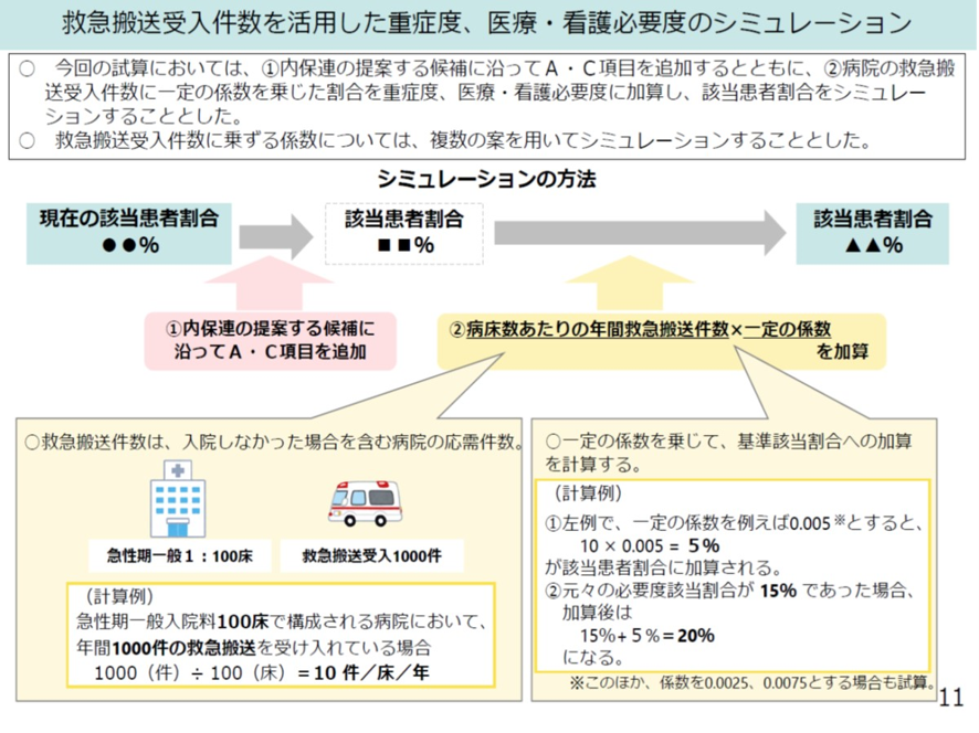 救急搬送というとかつては外科系救急搬送が多かった。しかし最近では高齢者の救急搬送が増え、その多くが誤嚥性肺炎、脳梗塞、心不全などの内科系救急が多い。こうした内科系救急の増加しているので、内科系救急搬送の受け入れ件数も指標化して、重症度、医療・看護必要度に反映すべきということになった。これまでもA項目で救急搬送により受け入れた患者について入院2日までを高いA得点の2点で評価していた。しかし救急患者の評価を入院日数で行うと、入院日数をあえて延長する例もでてくる。このため病床当たりの救急搬送件数を指数化し、重症度、医療・看護必要度に係数として上乗せする方法が考えられた。