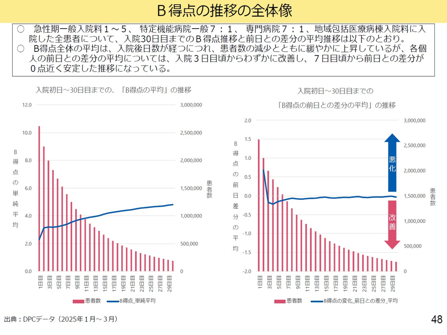 2024年改定では、急性期一般入院料1では、B項目については、「現場の負担軽減のために、即廃止・削除すべきと言う意見と、患者状態変化の継続的な把握のため継続が必要と言う議論が対立した。この結果、B項目は評価の対象から削除するが、測定は義務付けることになった。