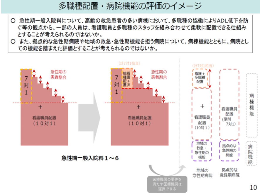 高齢者の救急搬送患者では、入院中の安静臥床によって、ADLが短期間で低下して、それが寝たきりの原因になり、在宅復帰を困難とする要因となっている。このため急性期病床においてもリハビリ職、管理栄養士などの配置が必要とされる。こうしたことから、高齢者の救急搬送患者を多く受ける10対1病棟では、10対1の看護師配置をベースに、多職種配置を加味して合計7対1の病棟として評価してはどうかとの議論が中医協で行われた。これは新たな地域医療構想の病院機能類型における「高齢者救急・地域急性期機能」をイメージした多職配置病棟であるとも言える。図表13にそのイメージを示した。この要件は急性期一般入院料4および急性期病院B一般入院料のうち、急性期一般入院料1と同等の重症度、医療・看護必要度等を満たす病棟が対象だ。そして看護配置基準を超えて看護職員、理学療法士、作業療法士、言語聴覚療法士、管理栄養士又は臨床検査技師のいずれかを配置した場合、「看護・多職種協働加算」を新設するとした。