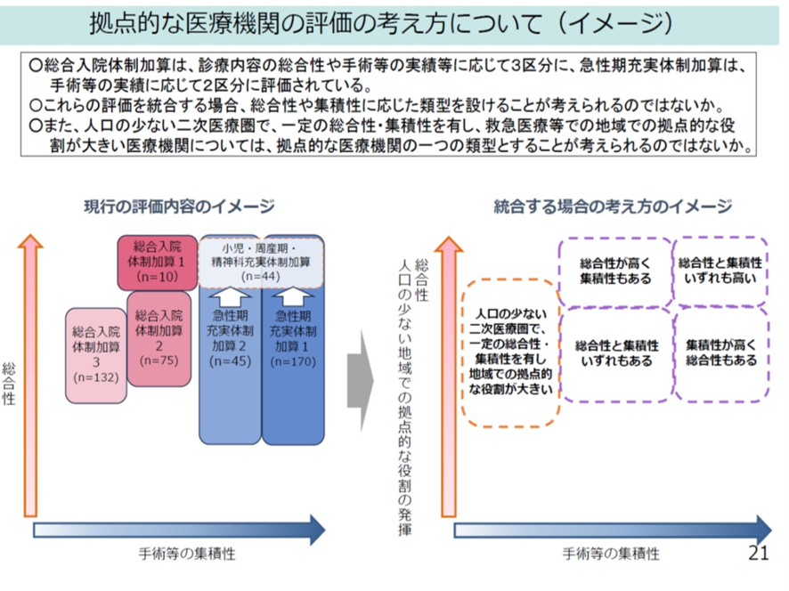 中医協の下部組織の入院外来分科会では上記の状況より、両加算を統合して拠点的な急性期機能をもつ病院として診療報酬上。両者の再編を行ってはという意見も出た。また人口が少ない医療圏においては、より要件を緩和した急性期拠点機能の病院を配置することにしてはどうかとの意見もでた。