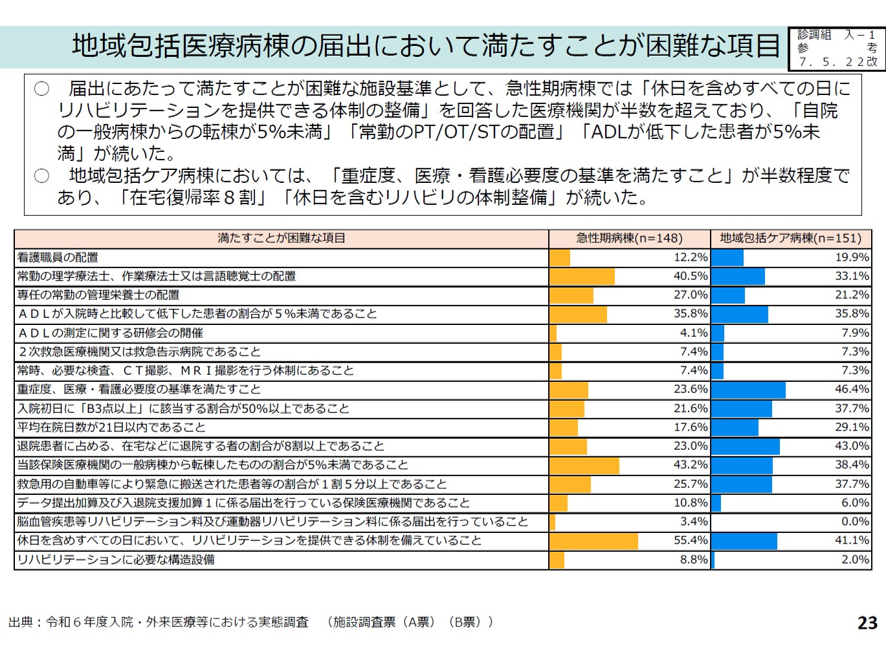 なかでも「ADLが入院時と比較して低下した患者割合が5%未満」という要件が厳しいと言う意見が多かった。ADLが低下する要因は85歳以上の高齢者、入棟時にすでに要支援・要介護状態の患者であることだ。地域包括医療病棟では、もともとこうした患者を受け入れが多いこともあり、こうした厳しい条件の中でADL低下を5%未満に抑えるのは容易ではない。この「ADL低下割合患者が5%未満」と言う要件については、中医協委員からは以下のコメントが出た。「この5%基準は、たとえば40床の病棟では、1人でもADLが低下すれば基準をクリアできなくなることになる。もともと高齢患者の多い地域包括医療病棟では基準の見直しが必要ではないか?」