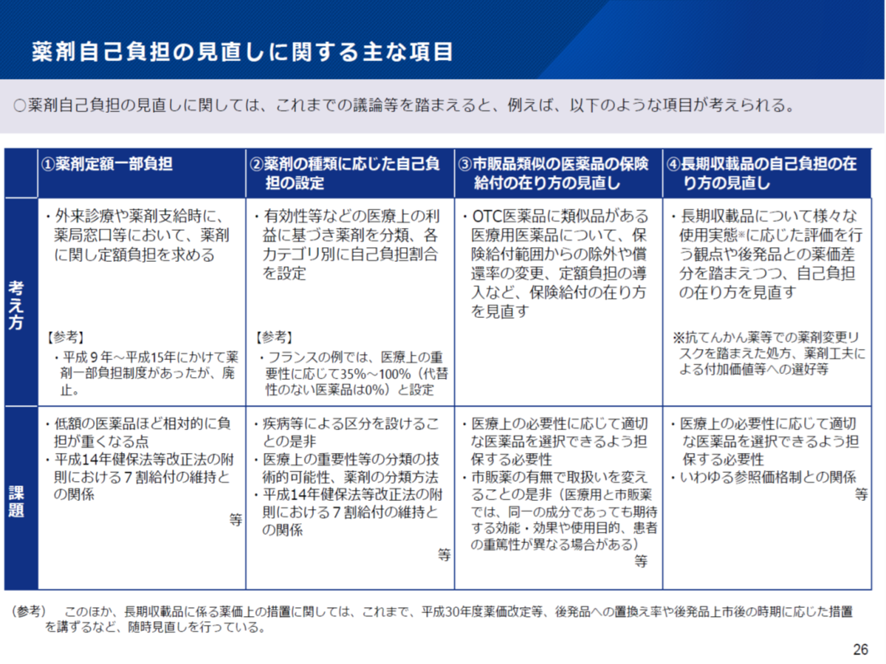 「長期収載品で求めているような別途の保険外負担(特別の料金)を求める新たな負担当を2026年度中に創設」(これには健康保険法の改正が必要)、「特別料金の対象の範囲となる医薬品は77成分(1100品目)とする。これはOTC医薬品と成分・投与経路が同一で、一日最大用量が異ならない医療用医薬品を機械的に選択」、「特別の料金は対象薬剤の薬剤費の4分の1とする」、「配慮が必要な患者はこども、がん患者、難病患者などの慢性疾患を抱えている方、低所得、入院患者、医師が対象医薬品の長期使用が医療上必要と認める患者」。