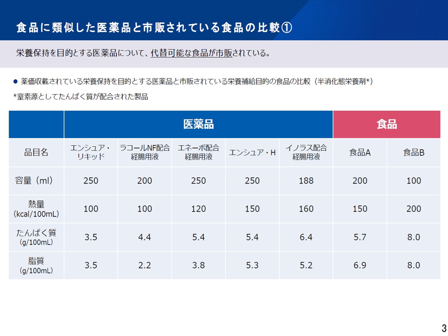 この関係は前述のOTC類似薬とOTCの関係によく似ている。OTC類似薬は医師の処方せんで出せるので、1~3割の自己負担ですむ。ところがOTC医薬品は自費払いなので、同じ有効成分でもOTC医薬品の方が圧倒的に高くなる。これと同様、エンシュア・リキッドは食品類似医薬品でOTC類似薬と同じだ。一方メイバランスは食品で外来では自費払いだ。国は2026年の診療報酬改定で、エンシュア・リキッドのような食品で代替することが可能な食品類似医薬品は、保険給付範囲を厳格化して、できるだけ保険適用からはずし食品であるメイバランスを使うことを勧めている。
